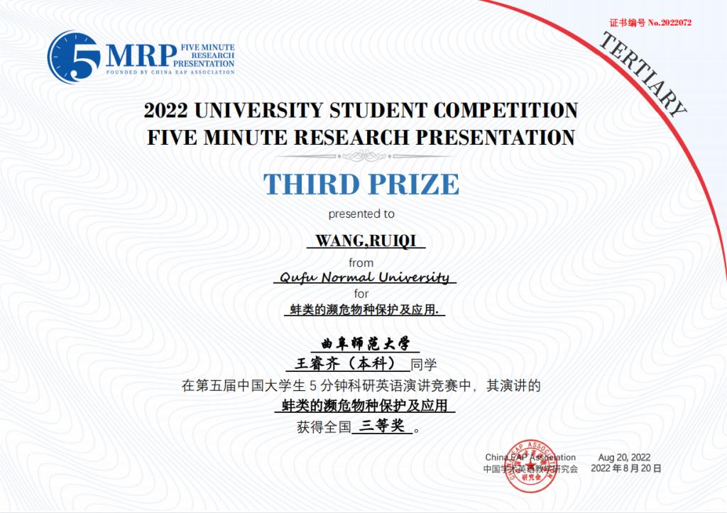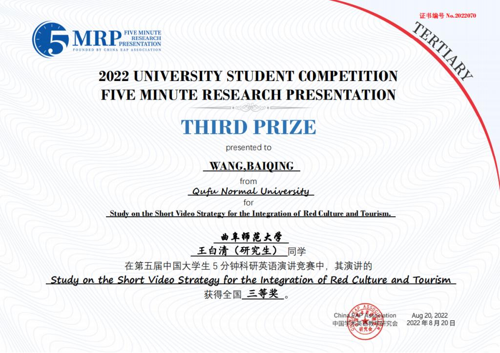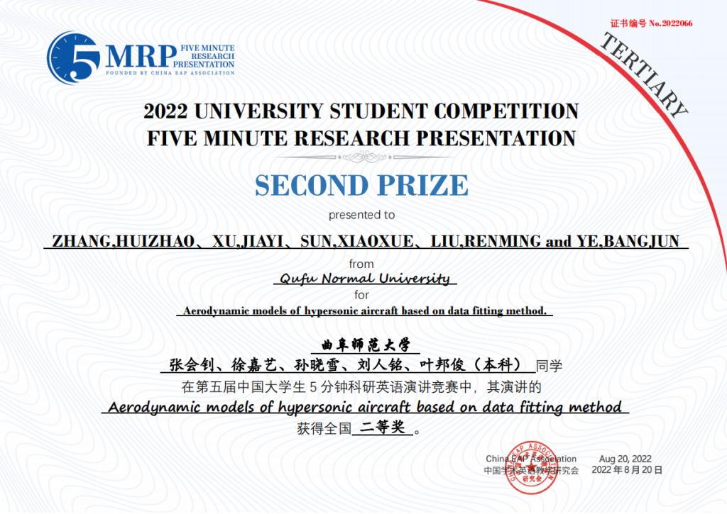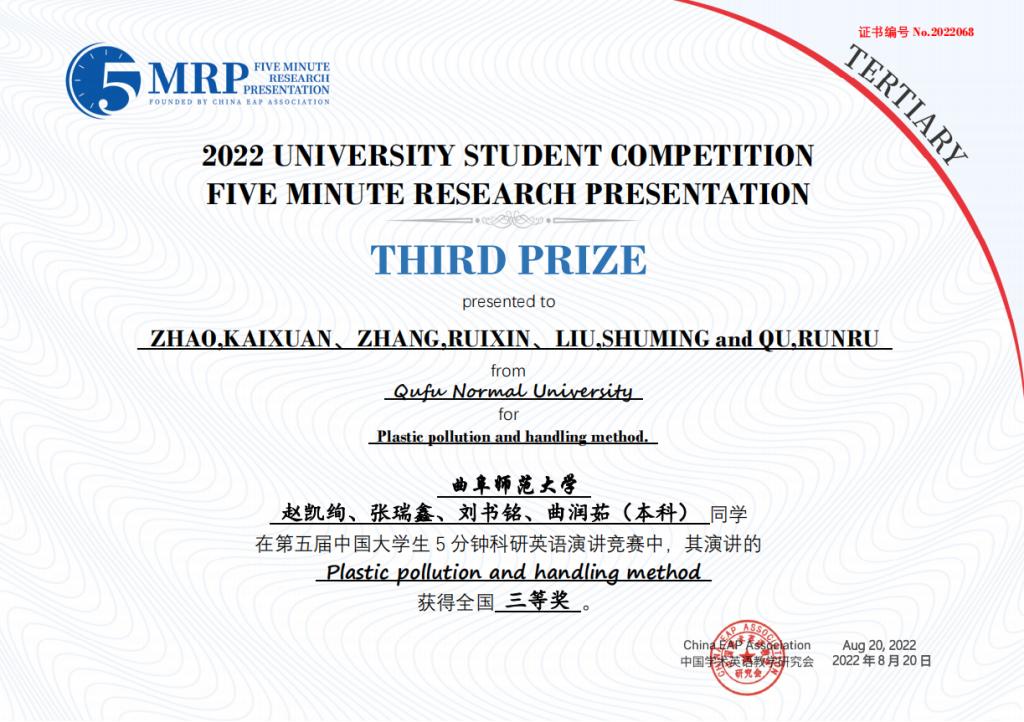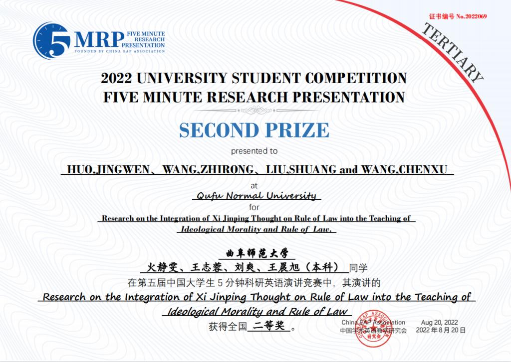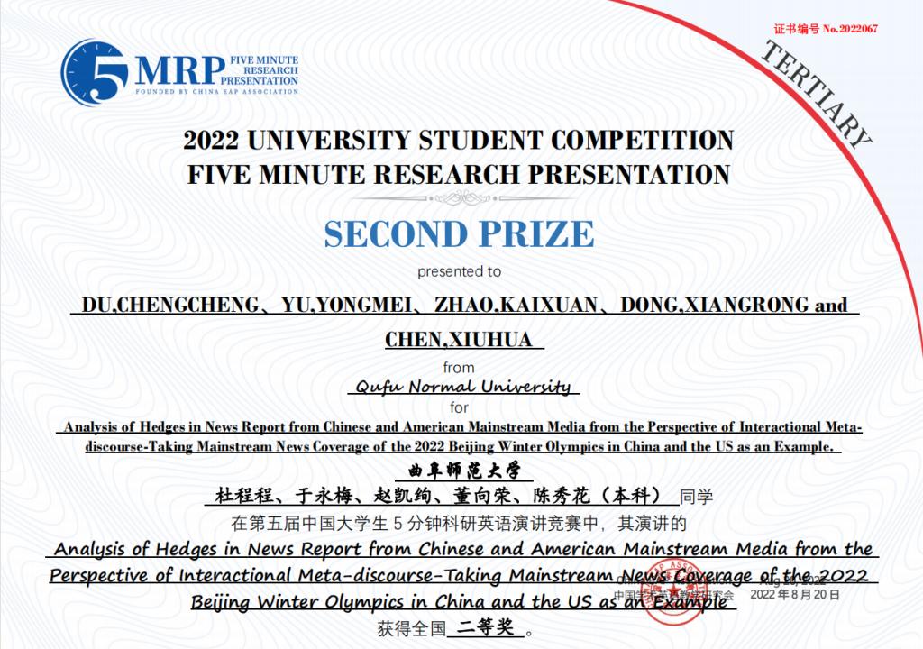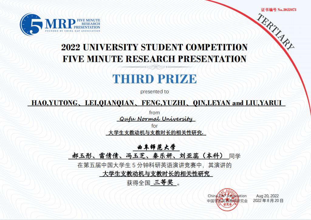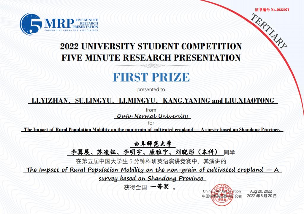 日前,第五届中国大学生五分钟科研英语演讲大赛在中国科学院大学圆满落下帷幕,由我校选拔推荐的8个团队取得优异成绩,获得全国一等奖1项、二等奖3项、三等奖4项。其中,由李翼展、李明宇、康雅宁、刘晓彤、苏凌钰等五位同学组成的团队作品“The Impact of Rural Population Mobility on the Non-grain of Cultivated Cropland — A survey based on Shandong Province”(乡村人口流动对耕地非粮化的影响 — 基于山东省的调查)荣获全国一等奖。门超元、孙丕苓等10位教师荣获优秀指导老师奖。
