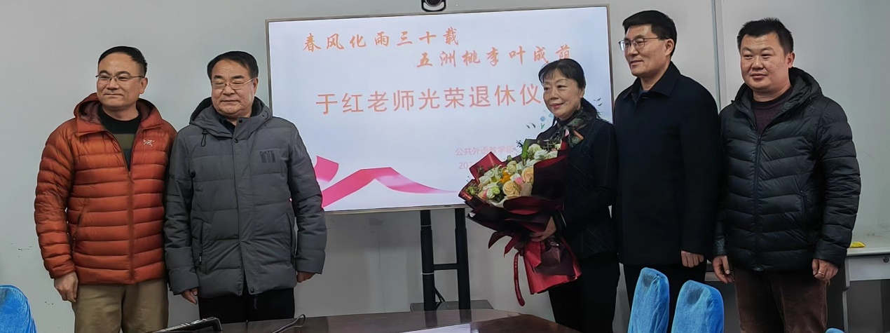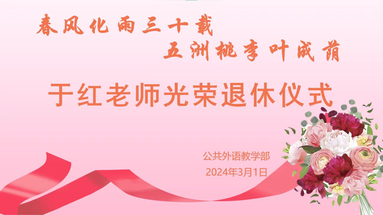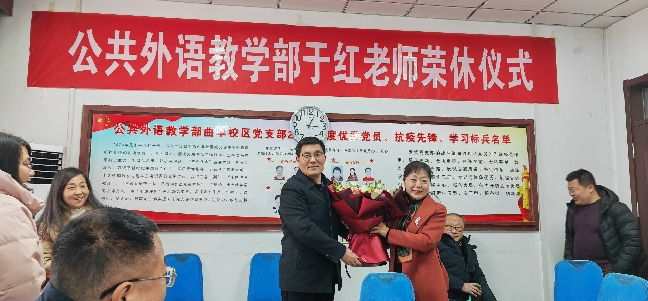 领导及全体教师出席了仪式并进行座谈。部工会主席刘淑杰老师主持了仪式。会上,王福祥主任代表全体教师向于红老师献上精心挑选的鲜花,表达了对于红老师三十余年兢兢业业、任劳任怨、辛勤工作的认可与感谢。