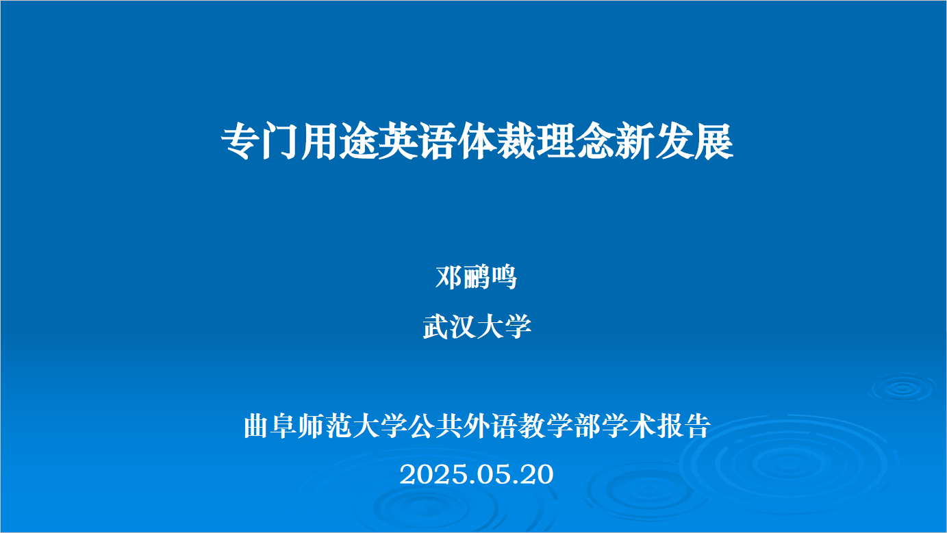 2025年5月20日下午,啪啪啦 啪啪啦 举办70周年校庆系列学术活动暨博雅讲坛第八场。武汉大学邓鹂鸣教授应邀作题为“专门用途英语体裁理念新发展”的学术报告,啪啪啦 全体教师参加活动。