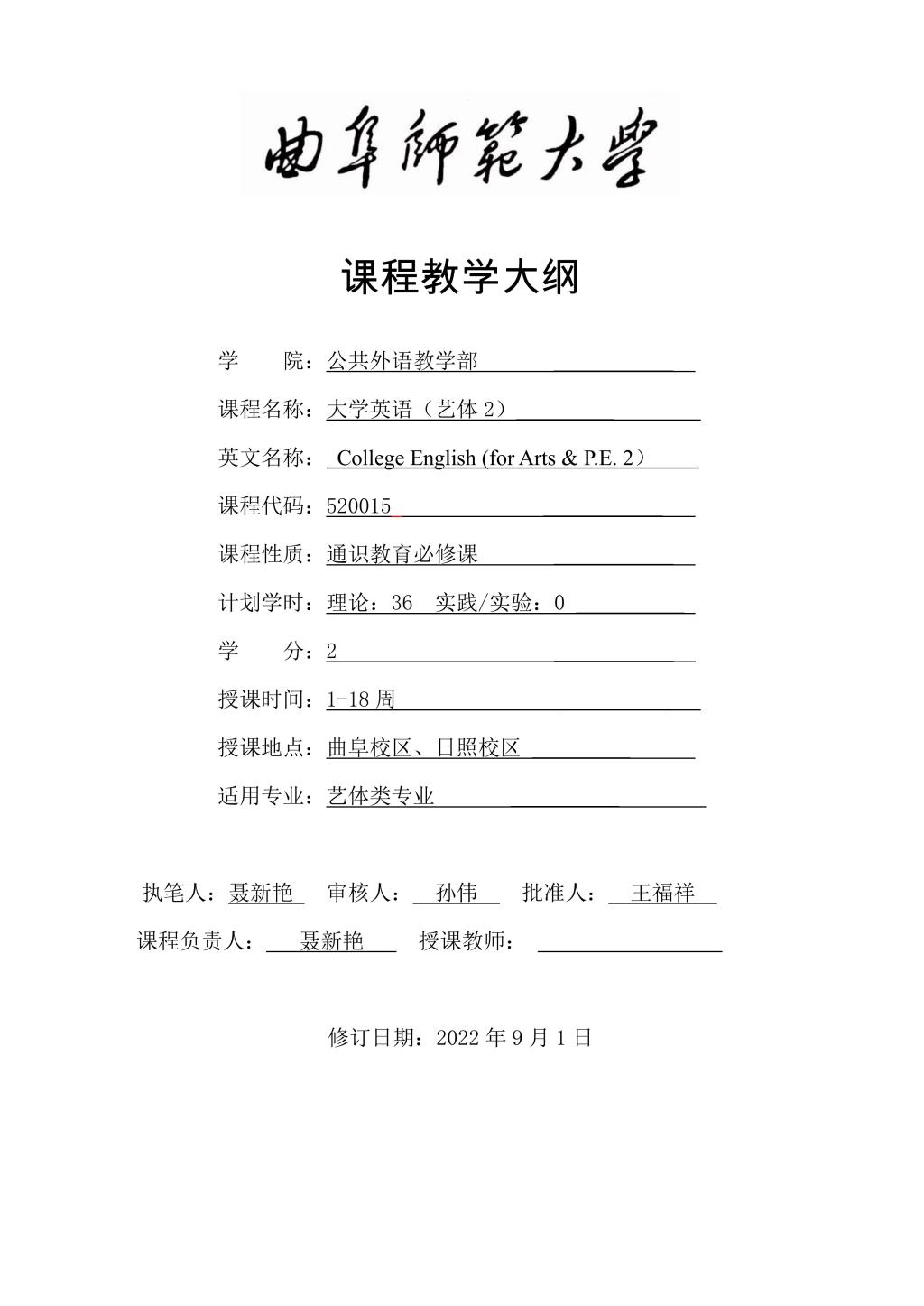 大学英语2(艺体)课程教学大纲(2022版)