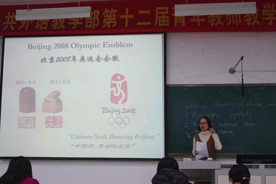 此外,弘扬主旋律、突出课程思政内容是本次教学比赛的一大亮点。选手们在教学中除了有“目的、要求、重点、难点、方法、教具准备 ”等常规环节外,还有意识地融入了“讲好中国故事”、“中国文化自信”等大学英语课程思政元素,把语言与生活、知识习得与社会发展联系起来,让学生在轻松愉快的氛围中接受培根铸魂的思想教育。评委们分别从教学内容、教学设计、教学方法与手段、整体教学效果等方面对选手的授课情况进行评比。最终,张玉凌、李梦实、王梅、裴沛等4位老师荣获三等奖;张晓宇、梁景会、牟晓等3位老师荣获二等奖;王瑾老师荣获一等奖,并将代表啪啪啦