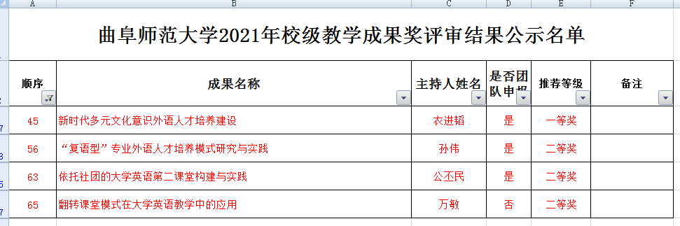 按照山东省教育厅和我校《关于开展2021年校级高等教育教学成果奖评选工作的通知》要求,我校组织了2021年校级教学成果奖评审,经个人申报、学院排序推荐、学校资格审核、初审和专家终审等环节,共评定教学成果奖特等奖22项、一等奖23项、二等奖23项。其中啪啪啦 衣进韬老师获得一等奖,孙伟老师、公丕民老师、万敏老师获得二等奖。