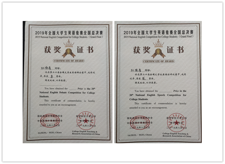 由国际英语外语教师协会中国英语外语教师协会和高等学校大学外语教学研究会联合主办,吉林省大学外语教学研究会协办,长春光华学院、英语辅导报社及考试与评价杂志社联合承办的2019年全国大学生英语竞赛(NECCS)全国总决赛于82—8日在长春光华学院顺利举行。由山东省省赛选拔的省级比赛特等奖、我校杜德春和王一含同学参加了本次全国总决赛,两位同学取得大赛优异成绩,杜德春同学获得全国大学生英语演讲比赛二等奖和全国大学生英语辩论赛三等奖,王一含同学获得全国大学生英语演讲比赛优秀奖。