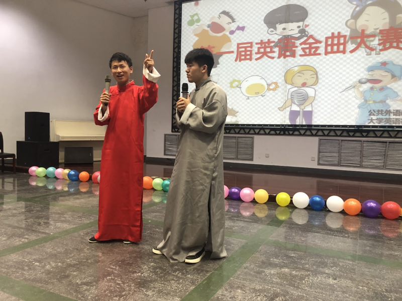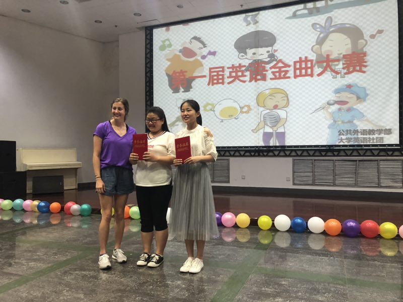 老师指导下,由大学社团举办的第一届外语金曲大赛决赛在大学生活动中心401举行。比赛邀请了正在我校进行访问交流的美国路易斯安那州立大学副校长埃蒙·哈尔平先生、国际交流处负责人妮娜·考克斯女士、交流生代表茉莉·帕克斯担任评委;李苗和柴源梓同学担任主持人。