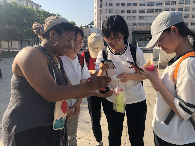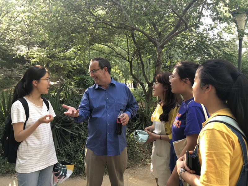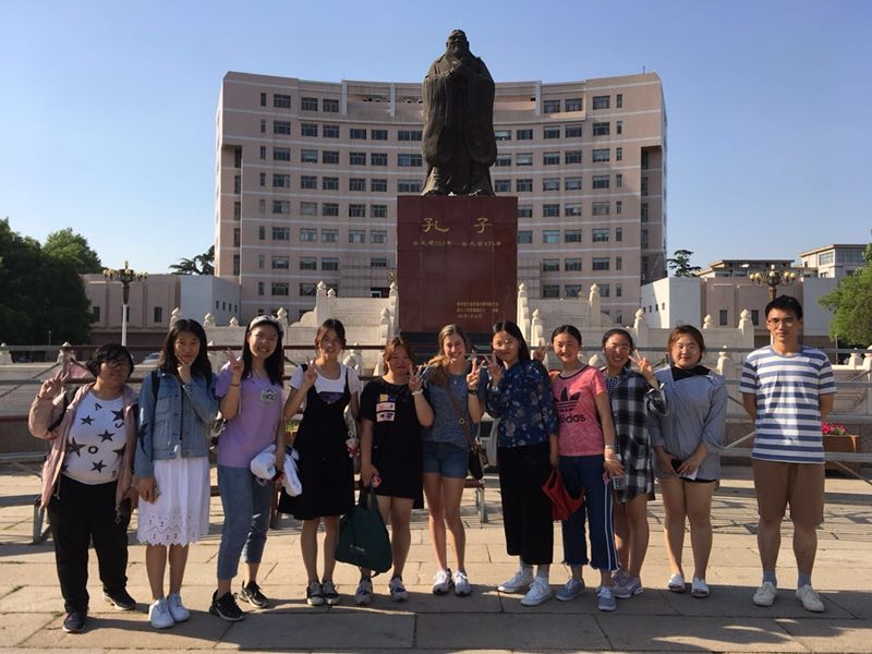在参观校园过程中,各小组根据各自的路线安排,向来访师生介绍了大学生活动中心、综合教学楼、图书馆、教师博物馆、孔子文化广场、书法学院等我校师生学习和生活的部分场所。我校同学积极细致的讲解使美国朋友进一步了解了我们美丽的校园及中国大学生生活。来访师生也热情地解答同学们关于英语学习,美国教育的方面的问题。