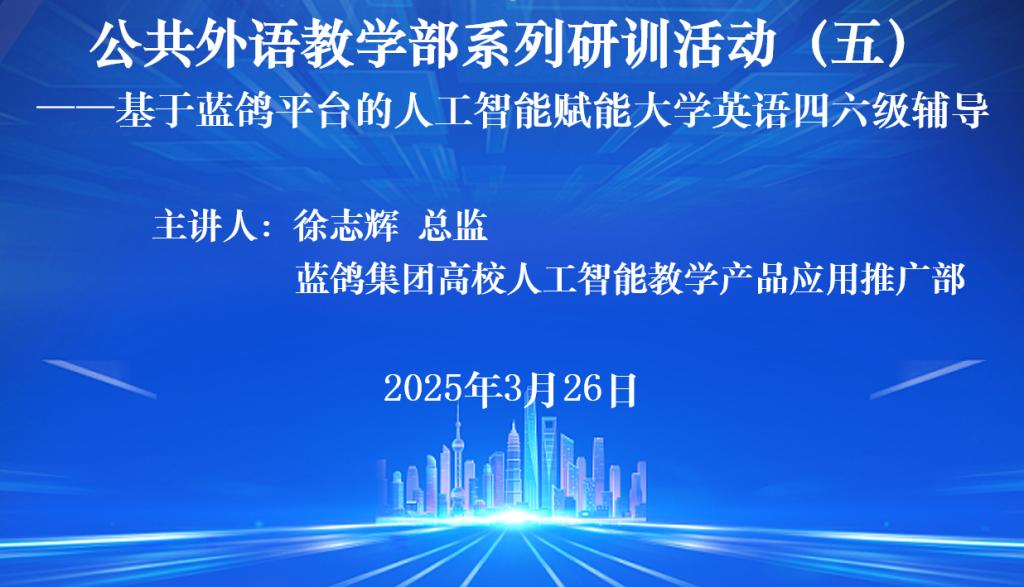 举办2024-2025学年春季学期第五场全员研训活动,本次研训以“基于蓝鸽平台的人工智能赋能大学英语四、六级辅导” 为主题,邀请蓝鸽集团有限公司高校人工智能教学产品应用推广部总监徐志辉作专题讲座,进行技术应用辅导,啪啪啦